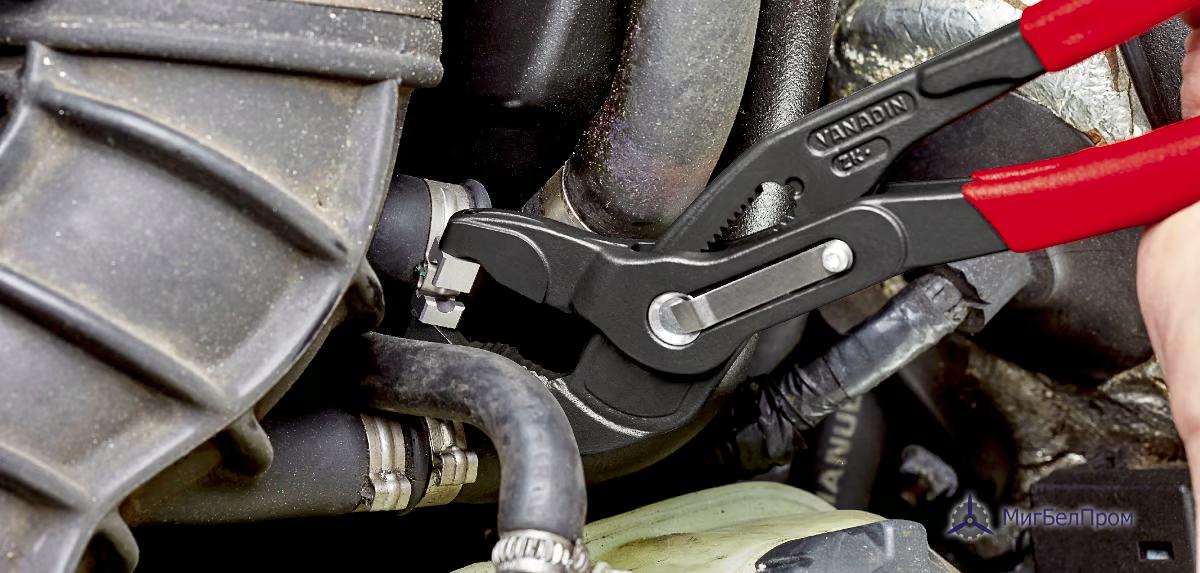 - Удобно работать с хомутами, например, на топливных шлангах, вакуумных линиях и всасывающих штуцерах